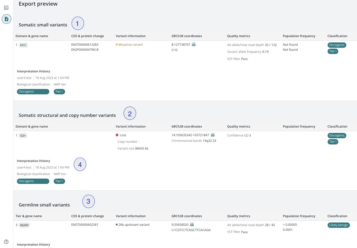 | 3 | Germline small variants | Shows all the relevant information and annotations about the somatic structural and copy number variant(s) that have been added for export. |