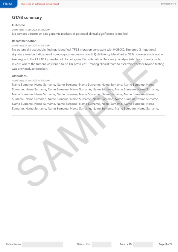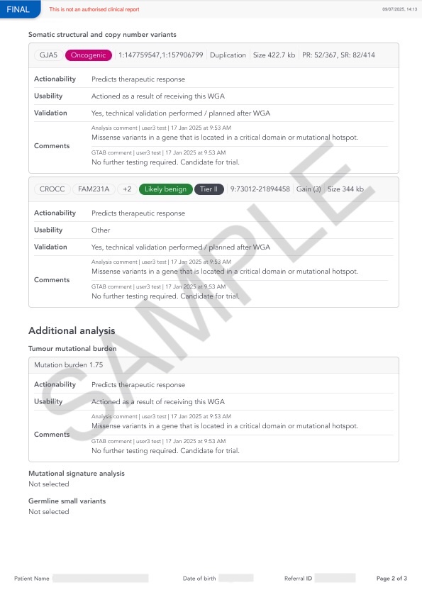 | 5 | Additional analysis | Shows all the relevant information about the tumour mutational burden, mutational signature analysis, and circos plots that have been added to the GTAB summary, including interpretation and comments for each of these plots. Please refer to the Global Analysis Plots for more details. |