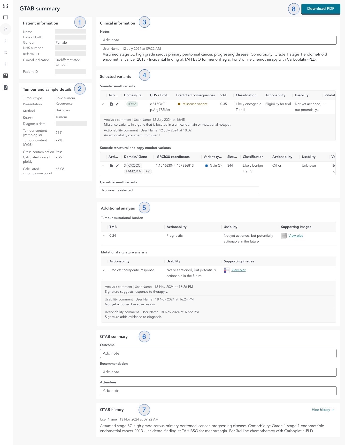 | 6 | GTAB summary | Text boxes to write GTAB outcome, recommendation, and attendees information to the GTAB summary. Please refer to the GTAB summary section to learn how to add GTAB-related notes. |