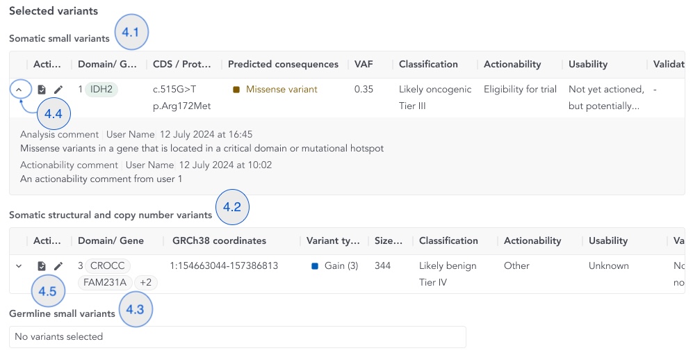 This panel (section 4 of the GTAB summary) allows you to review all the somatic and germline variants that have been added to the GTAB summary, including their interpretation, classification, and any comments added during the analysis of each variant.