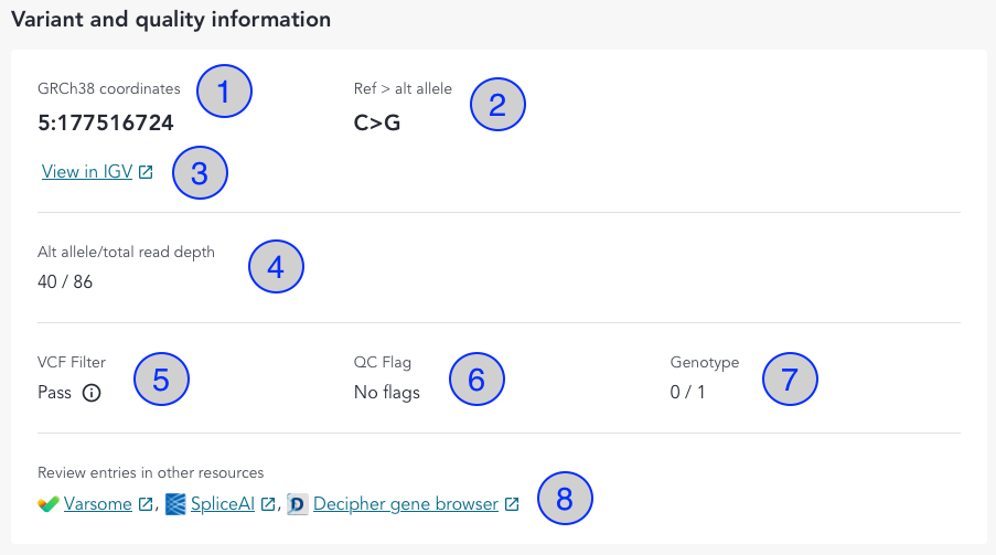 | 8 | Resource Linkouts | Utilise these links to open the variant in other resources and databases e.g., Varsome. Clicking on the Varsome link out will open the variant in Varsome, with the "annotation-mode" set to germline. Clicking on the SpliceAI link out will open the variant in SpliceAI with default settings applied. Clicking on the Decipher link out will open the Decipher gene track within the genomic region specified by the variant GRCh38 coordinates. |