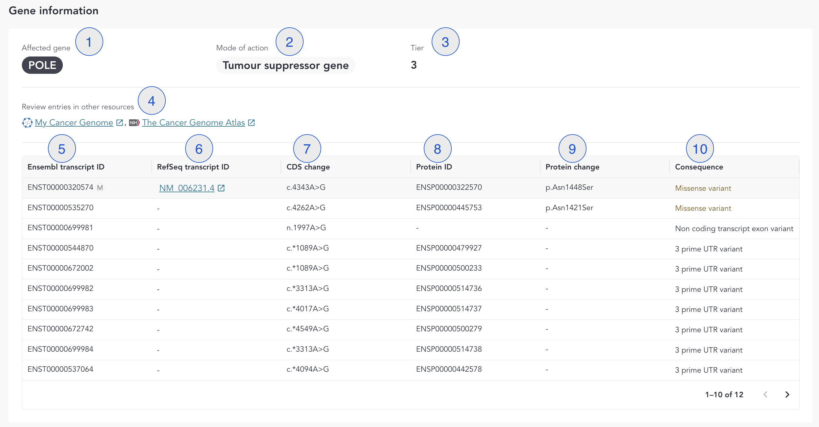 | 5 | Ensembl transcript ID | Ensembl transcript ID and MANE Select or MANE Plus Clinical transcript flags if applicable. |