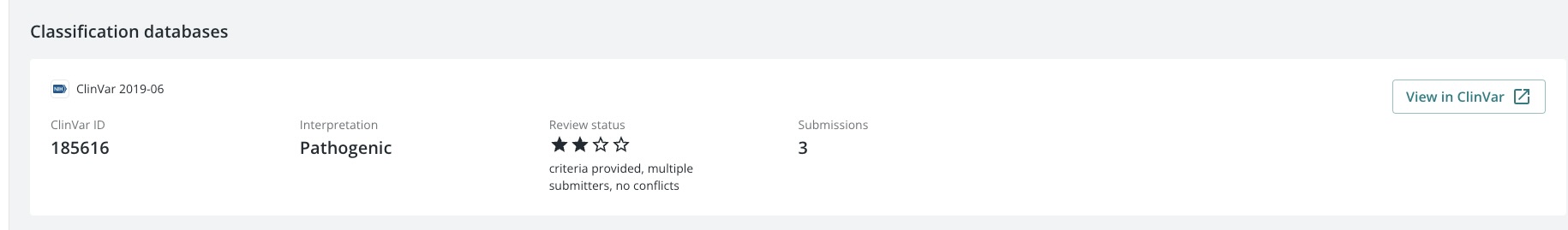 - Lists any matching entries in ClinVar