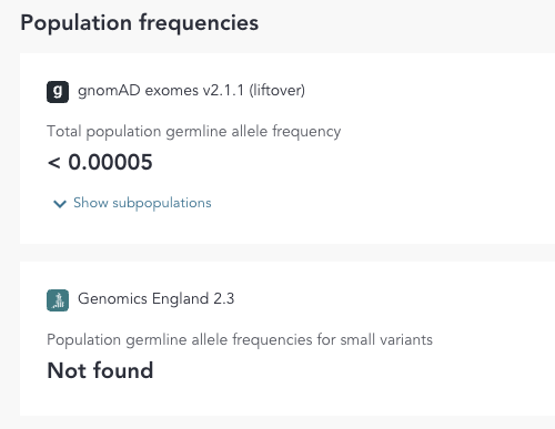 - This panel displays the population germline allele frequency obeserved in population databases including