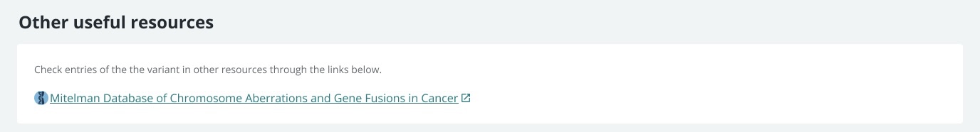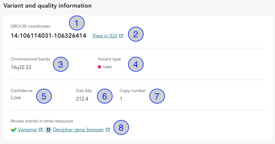 | 8 | Resource Linkouts | Utilise these links to open the variant in other resources and databases e.g., Varsome. Clicking on the Varsome link out will open the variant in Varsome, with the "annotation-mode" set to somatic. Some copy number variants may be too large to analyse in Varsome. Clicking on the Decipher link out will open the Decipher gene track within the genomic region specified by the variant GRCh38 coordinates. |