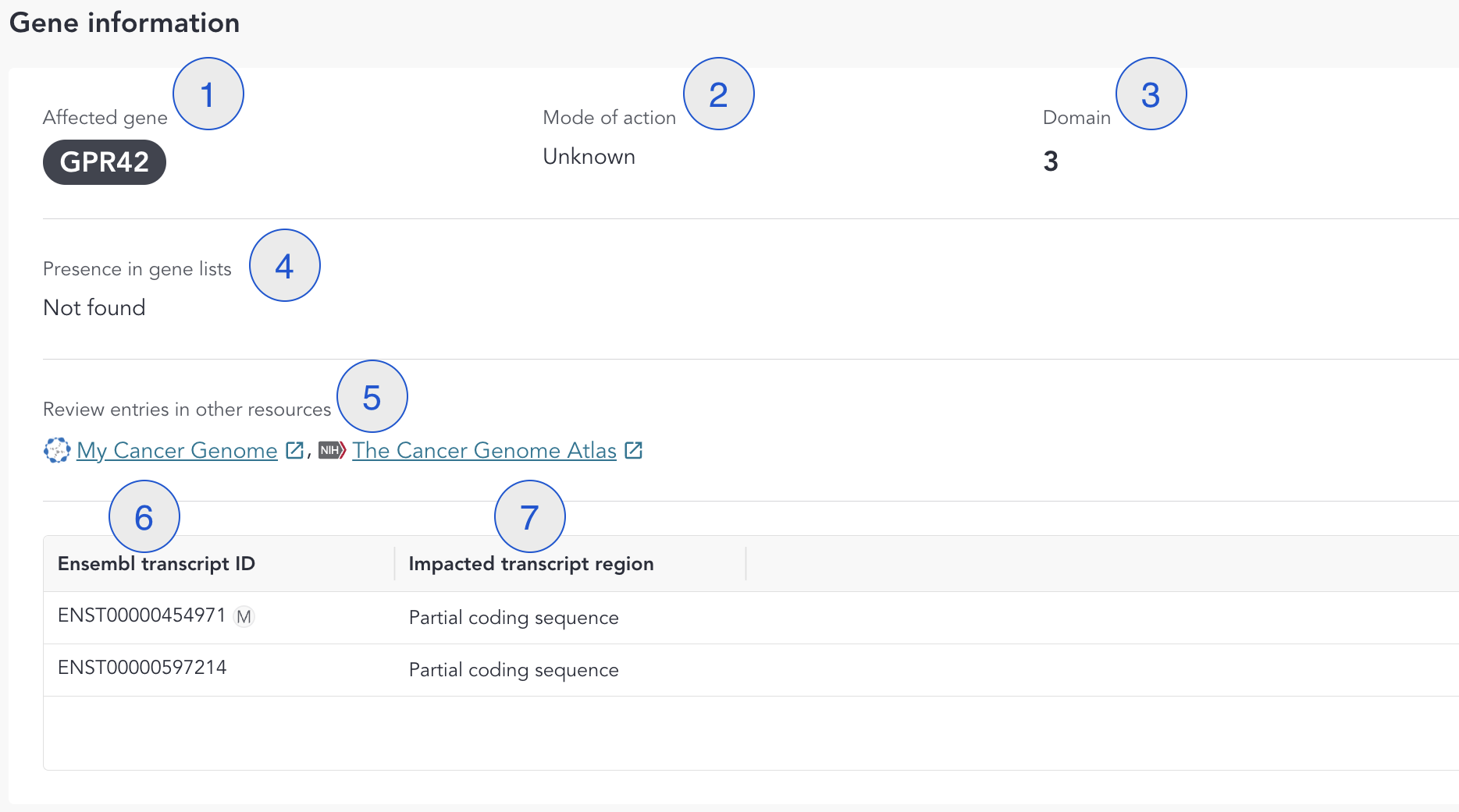 | 1 | Affected gene | HGNC Gene symbol of the affected gene. |