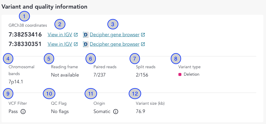 | 1 | GRCh38 coordinates | The chromosome and position for each breakpoint of the variant. If the genomic coordinates of a structural variant is shown as "Not available", the variant has been called by Pelops which detects the presence of a rearrangement, but not the precise breakpoint coordinates. Consequently, the partner break-end location also cannot be precisely determined, so Pelops returns a 1-2 kb region instead. |