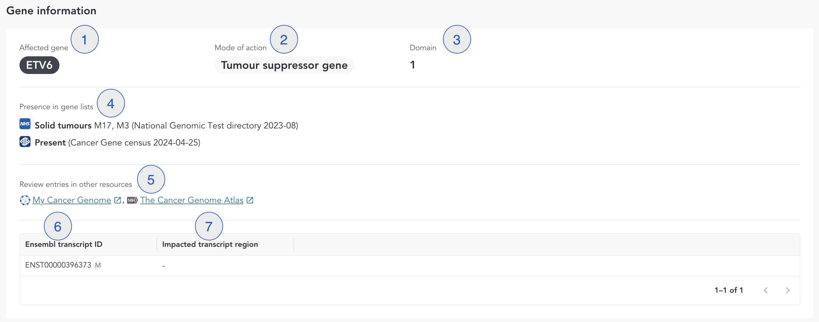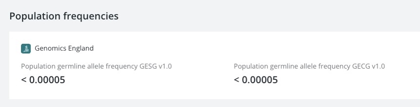 | 4 | Presence in gene lists | Indicates if gene is listed in NHS National Genomic Test Directory (NGTD) and/or Cancer Gene Census. For NGTD, we will also list Clinical Indications that match the patient's clinical indication group. |