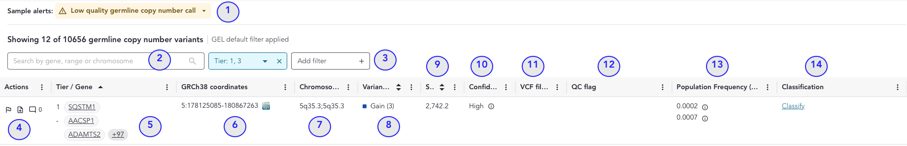 | 3 | Filters | Add or remove filters applied to the variant grid. By default, the variant grid will be filtered to display variants in genes belonging to Tier 1 and Tier 3. |