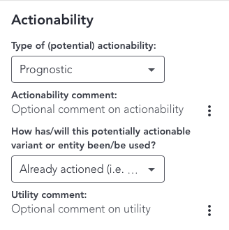 - In the "Actionability" section of the interpretation drawer, under "Type of (potential) actionability:" click the dropdown arrow and choose the appropriate choice(s)