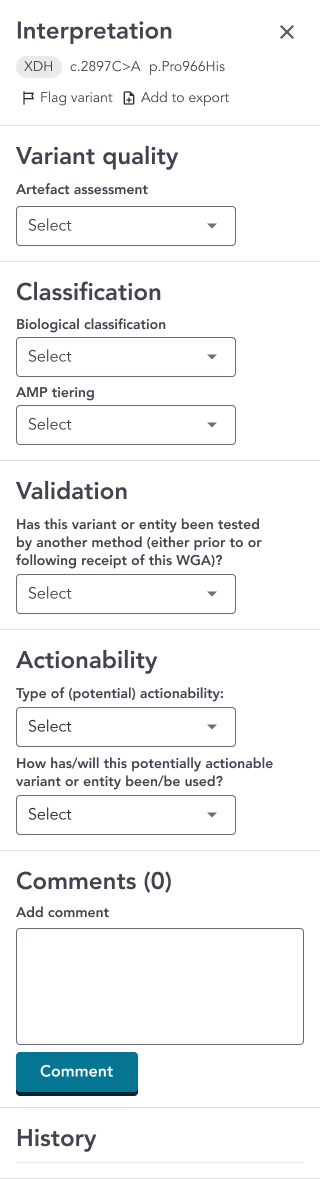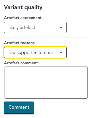If a variant has been marked as a likely artefact, the interpretation drawer will display this additional comment box. To add a supporting comment to your artefact assessment, follow these additional steps:
