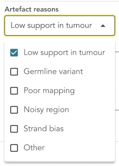 If a variant has been marked as a likely artefact, the interpretation drawer will display this additional field. To indicate the reason why the variant is likely to be a technical artefact, follow these additional steps: