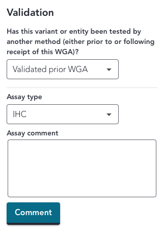 If your previous selection indicated the variant has been validated by another method, an "Assay comment" box will also appear. To add a comment to support the assay types selected, follow these additional steps: