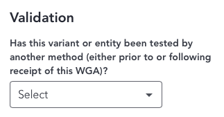 - In the "Validation" section of the interpretation drawer, under "Has this variant or entity been tested by another method (either prior to or following receipt of this WGA)?" click the dropdown arrow and choose the appropriate choice