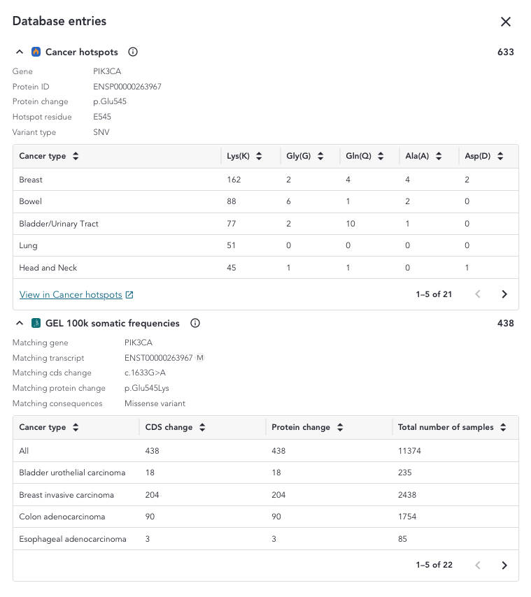 On your variant of interest in the database column, if the variant has been found to match any of the databases included in the database overlay (Cancer Hotspots or the GEL 100k somatic frequencies) clicking 'All entries' will expand the database entries overlay (example shown below). For further information on the data displayed, see variant annotations.