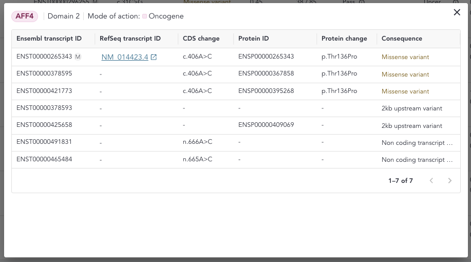 | 6 | Domain and gene | Domain and HGNC gene symbol(s) which the variant affects. The affected genes in the highest domain are shown by default. |