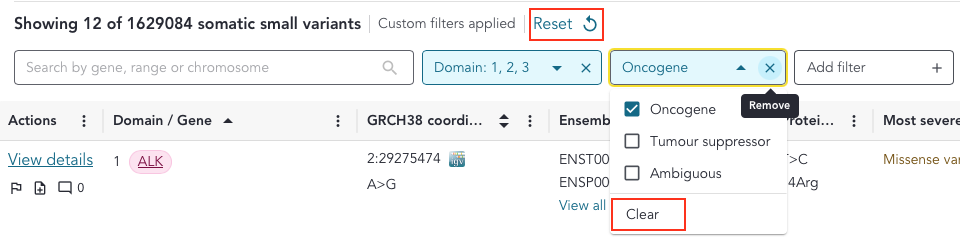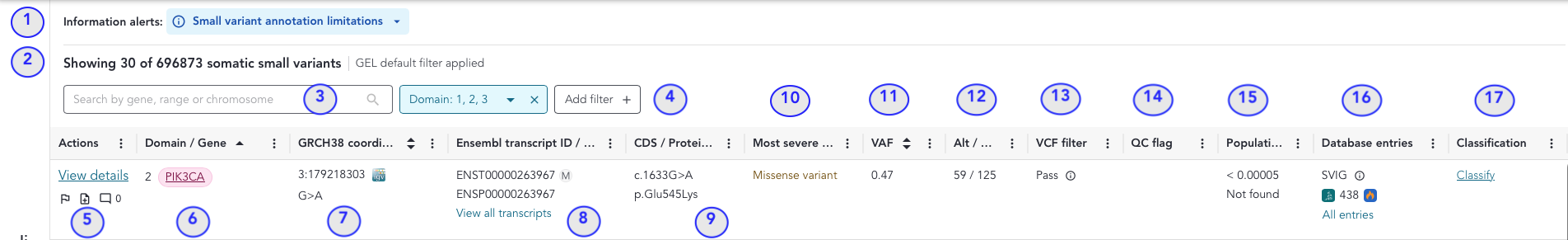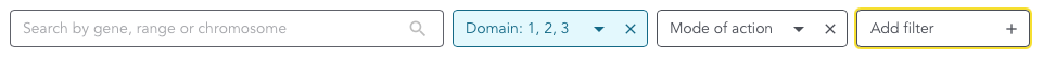 | 4 | Filters | Add or remove filters applied to the variant grid. By default, the variant grid will be filtered to display variants in genes belonging to Domain 1, Domain 2 and Domain 3. |