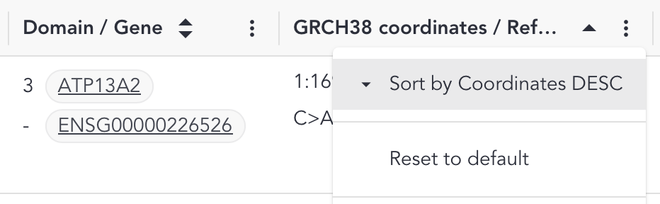 - To reset the variant grid to the default sorting order (by Domain) click the three dots on the column header and select 'Reset to default'