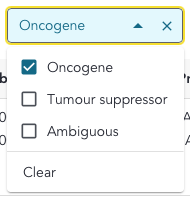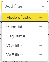 - Click on the arrow dropdown and select your filter options e.g., Mode of Action, Oncogene. The variant grid will update accordingly