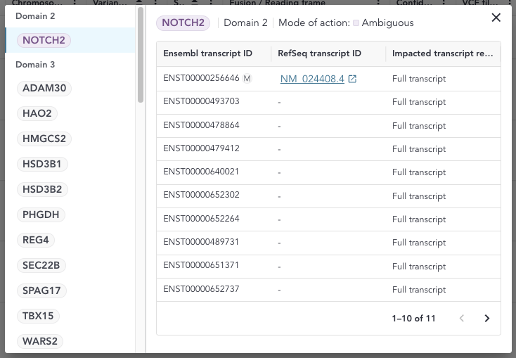 | 5 | Domain and gene | Domain and HGNC gene symbol(s) which the variant affects. Affected genes in the highest domain are shown by default. |