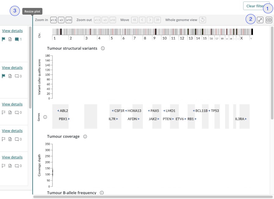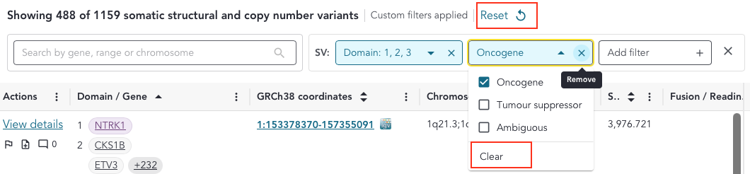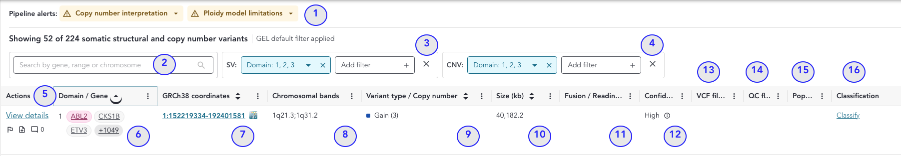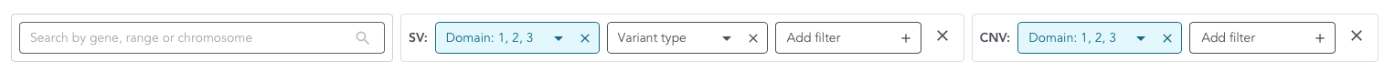 | 3 | Filters | Add or remove filters applied to the variant grid. By default, the variant grid will be filtered to display variants in genes belonging to Domain 1, Domain 2 and Domain 3. |