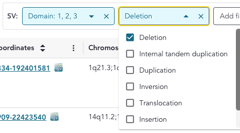 - Click on the arrow dropdown and select your filter options e.g., Variant Type, Deletion. The variant grid will update accordingly