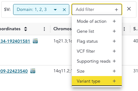 - Sort the list of variants (e.g. by domain, genomic coordinate, copy number or size)